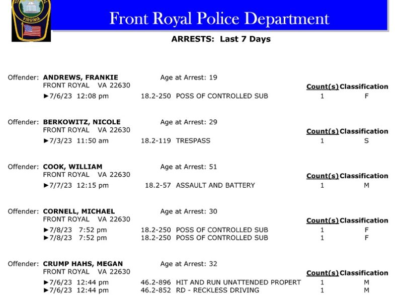 Arrest Logs POLICE: 7 Day FRPD Arrest Report 7/10/2023 Published 2 years ago on July 10, 2023 By PRESS RELEASE Front Royal Police Department’s arrest report for the past 7 days: Related Topics:arrest reportFront Royal Police Department Up Next POLICE: 7 Day FRPD Arrest Report 7/17/2023 Don't Miss POLICE: 7 Day FRPD Arrest Report 7/3/2023 Front Royal, VA52°Showers in the Vicinity7:25 am4:54 pm ESTFeels like: 48°FWind: 8mph WSWHumidity: 85%Pressure: 29.48"HgUV index: 0SatSunMon48°F / 37°F52°F / 23°F45°F / 34°F