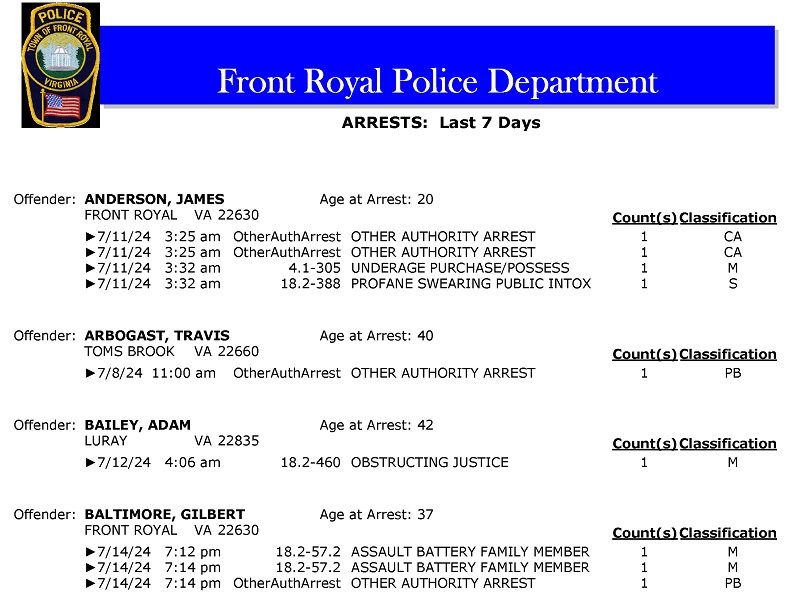 Front Royal Police Department’s arrest report for the past 7 days: