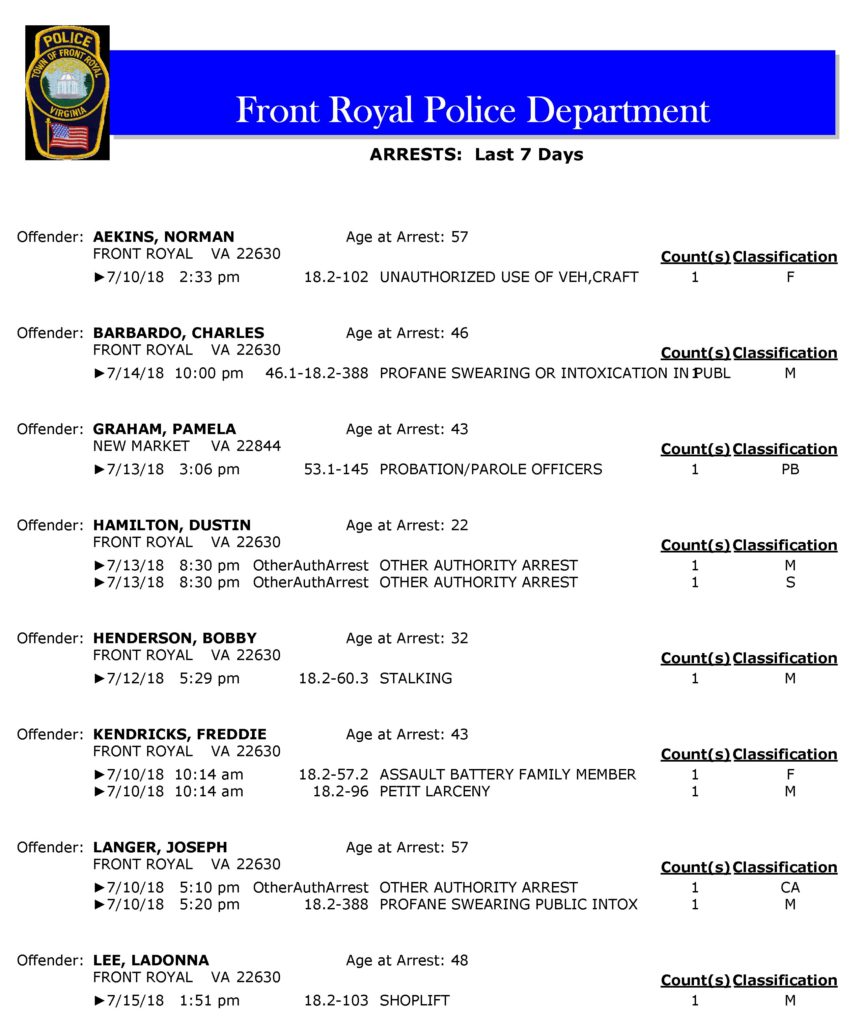 POLICE: 7 Day FRPD Arrest Report 7/16/2018