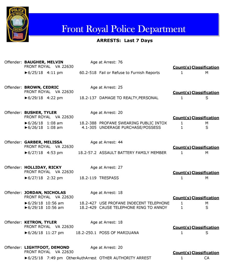 POLICE: 7 Day FRPD Arrest Report 7/2/2018