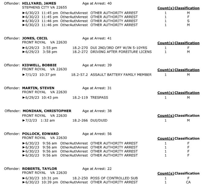 Front Royal Police Department’s arrest report for the past 7 days: