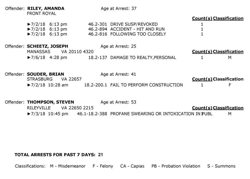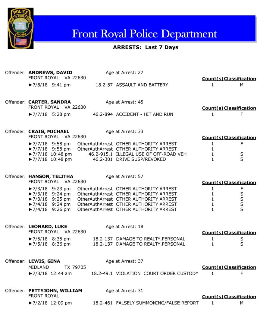 POLICE: 7 Day FRPD Arrest Report 7/9/2018