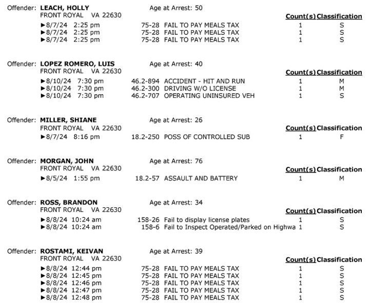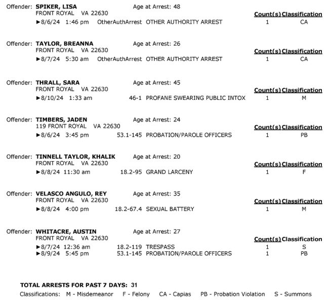 Front Royal Police Department’s arrest report for the past 7 days: