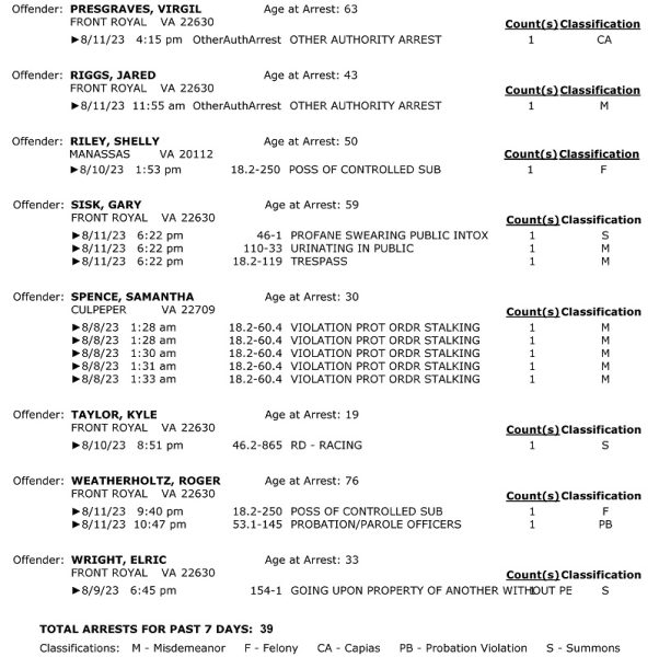 Front Royal Police Department’s arrest report for the past 7 days: