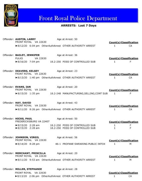 POLICE: 7 Day FRPD Arrest Report 8/17/2020