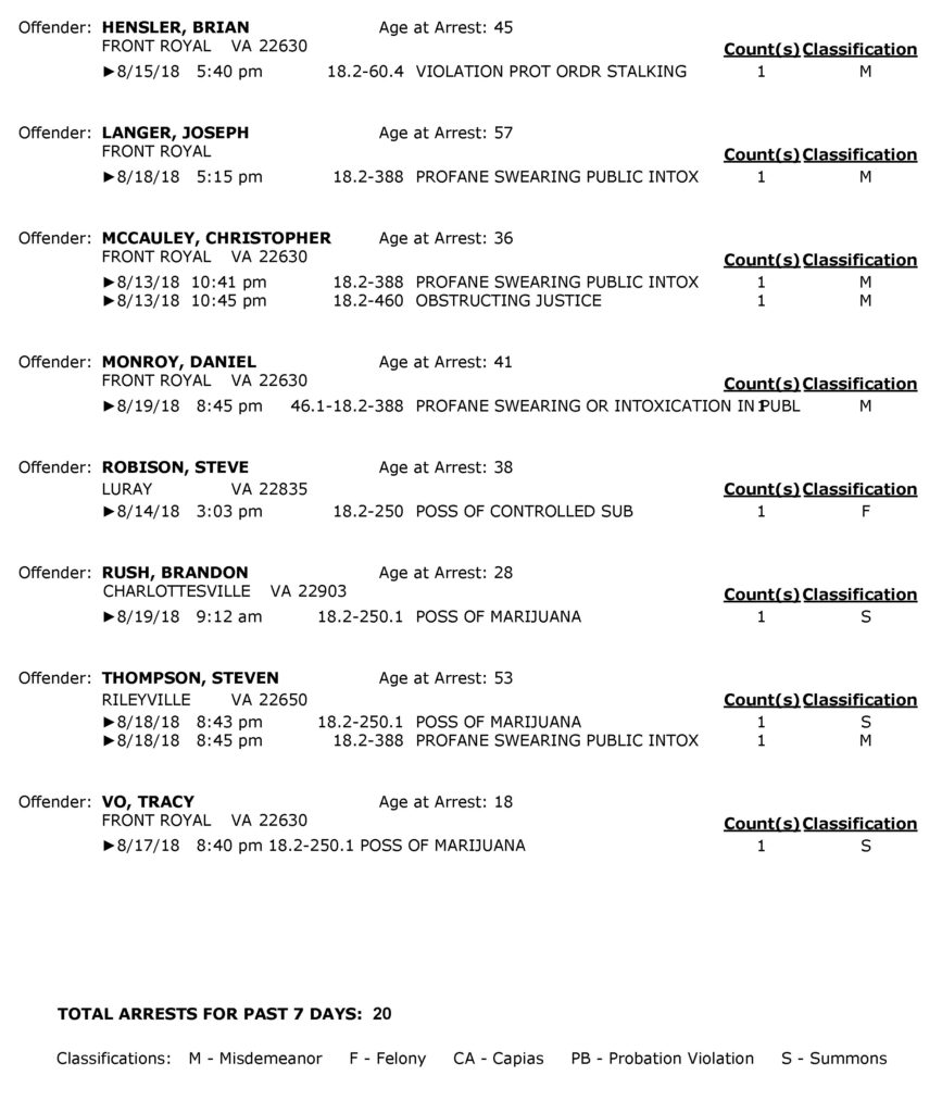 POLICE: 7 Day FRPD Arrest Report 8/20/2018