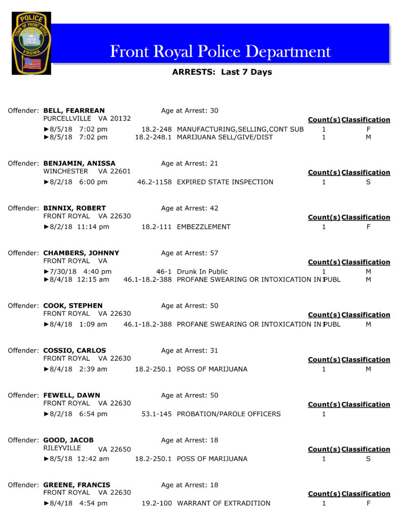 POLICE: 7 Day FRPD Arrest Report 8/6/2018