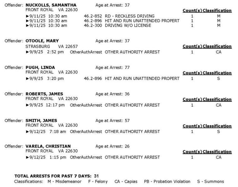 Arrest Logs POLICE: 7 Day FRPD Arrest Report 9/15/2025 Published 3 months ago on September 15, 2025 By PRESS RELEASE Front Royal Police Department’s arrest report for the past 7 days: Related Topics:arrest reportFront Royal Police Department Up Next POLICE: 14 Day FRPD Arrest Report 9/15/2025 Don't Miss POLICE: 7 Day FRPD Arrest Report 9/8/2025 Front Royal, VA48°Cloudy7:25 am4:54 pm ESTFeels like: 46°FWind: 8mph SSEHumidity: 95%Pressure: 29.64"HgUV index: 0SatSunMon48°F / 37°F52°F / 23°F43°F / 32°F