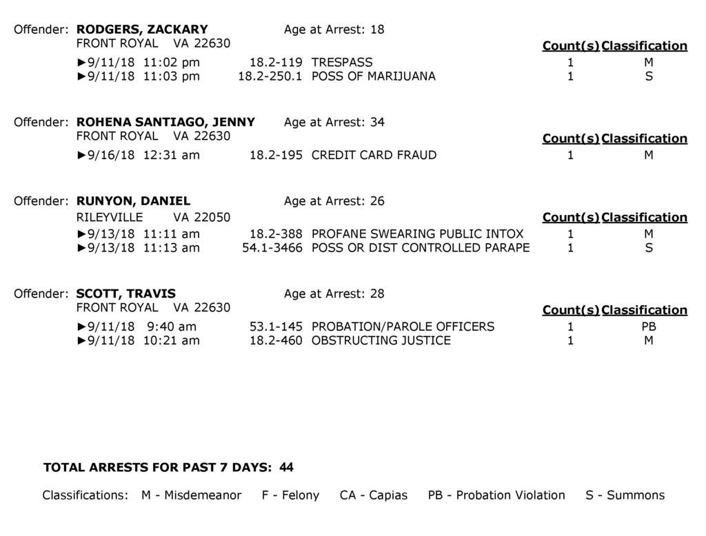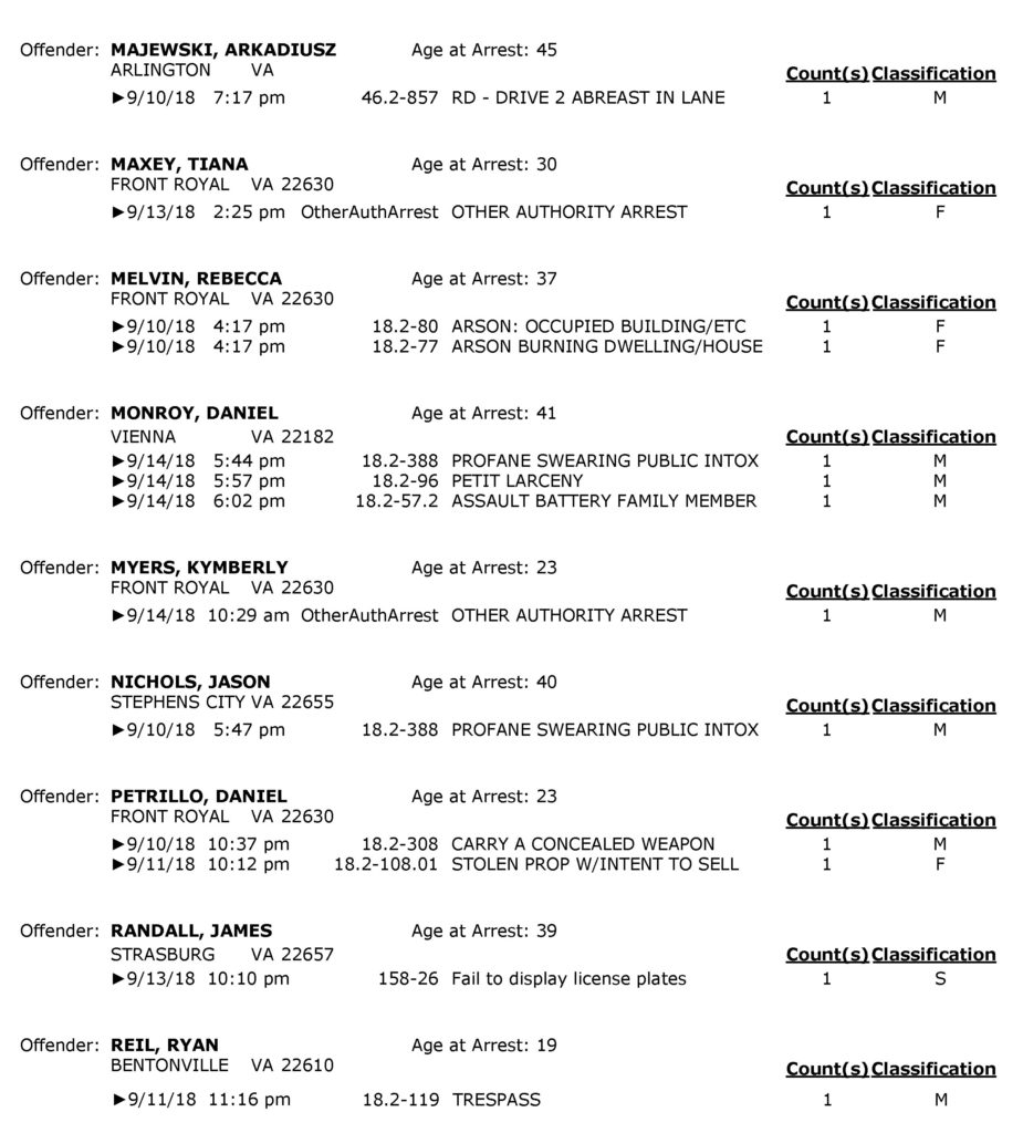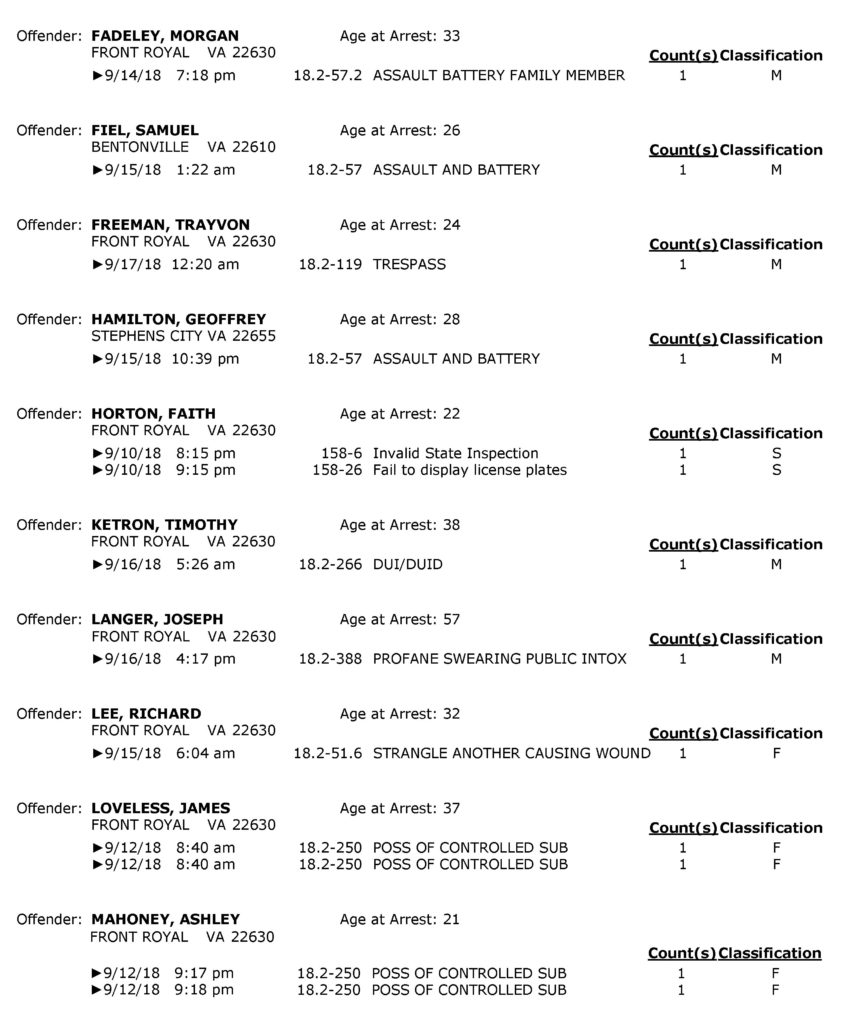 POLICE: 7 Day FRPD Arrest Report 9/17/2018