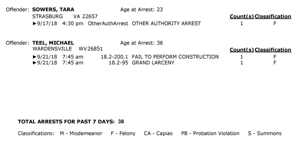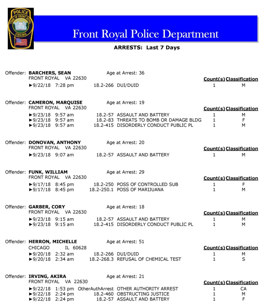 POLICE: 7 Day FRPD Arrest Report 9/24/2018