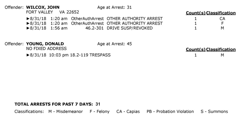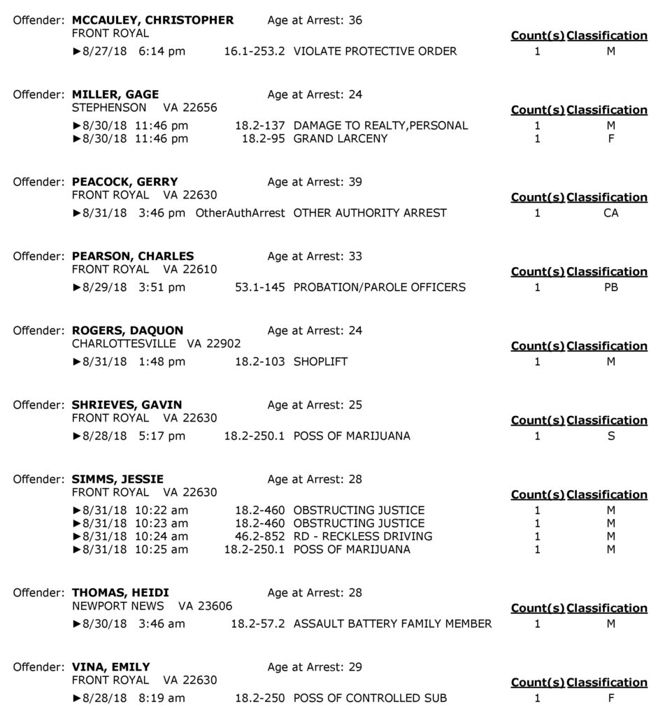 POLICE: 7 Day FRPD Arrest Report 9/3/2018