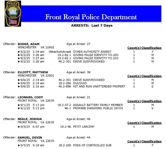 Arrest Logs POLICE: 7 Day FRPD Arrest Report 9/8/2025 Published 1 month ago on September 8, 2025 By PRESS RELEASE Front Royal Police Department’s arrest report for the past 7 days: Related Topics:arrest reportFront Royal Police Department Up Next POLICE: 7 Day FRPD Arrest Report 9/15/2025 Don't Miss POLICE: 7 Day FRPD Arrest Report 9/1/2025 Front Royal, VA61°Cloudy7:28 am6:25 pm EDTFeels like: 61°FWind: 9mph WHumidity: 34%Pressure: 29.81"HgUV index: 0ThuFriSat61°F / 36°F59°F / 34°F61°F / 37°F