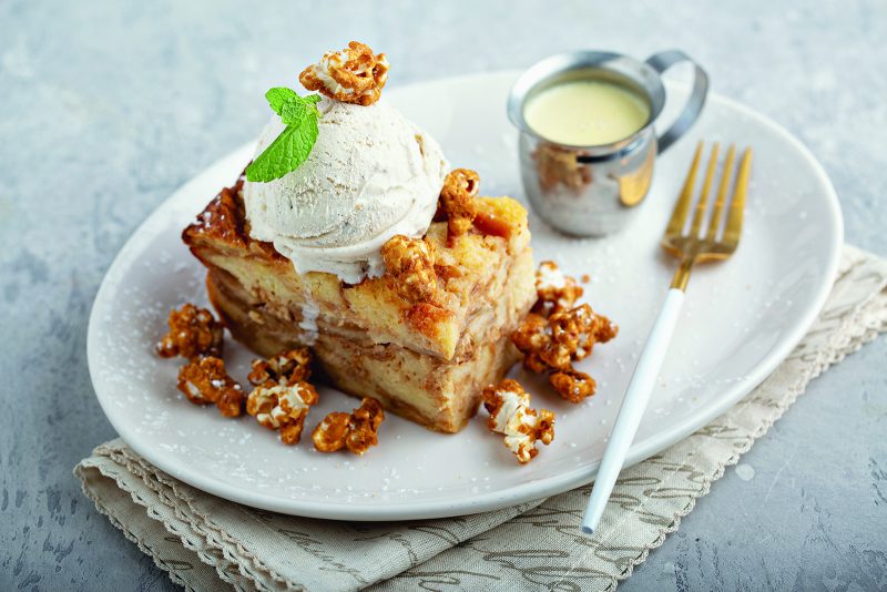 Caramel apple bread pudding with ice cream and popcorn, fall dessert