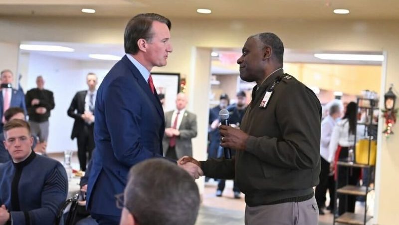 Virginia Military Institute Superintendent Ret. Major Gen. Cedric Wins welcomes Gov. Glenn Youngkin on Dec. 12, 2024. (Photo courtesy of Cedric Wins/Instagram)