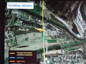 Before & After – Coordinated signaling in the Quadrant Roadway Intersection system eliminating left turns at Route 522-55 intersection are forecast to reduce future rush-hour, southbound backups from across the North Fork Bridge (yellow lines above) with traditional designs; back to only Duck Street in the Quadrant system (yellow lines, solid & dotted below).