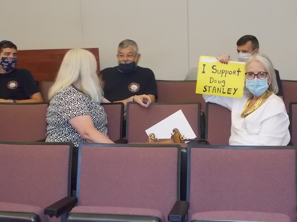 The writing was on the wall for Doug Stanley, above, at a July 8 Special Meeting called by Board of Supervisors to facilitate an as neutral ‘involuntary separation’ as possible from the county administrator’s perspective. Below, Stanley supporters on staff who were present were warned ‘no cheers or tears (or signs once meeting started)’ or face removal by sheriff’s deputies. Royal Examiner File Photos by Roger Bianchini