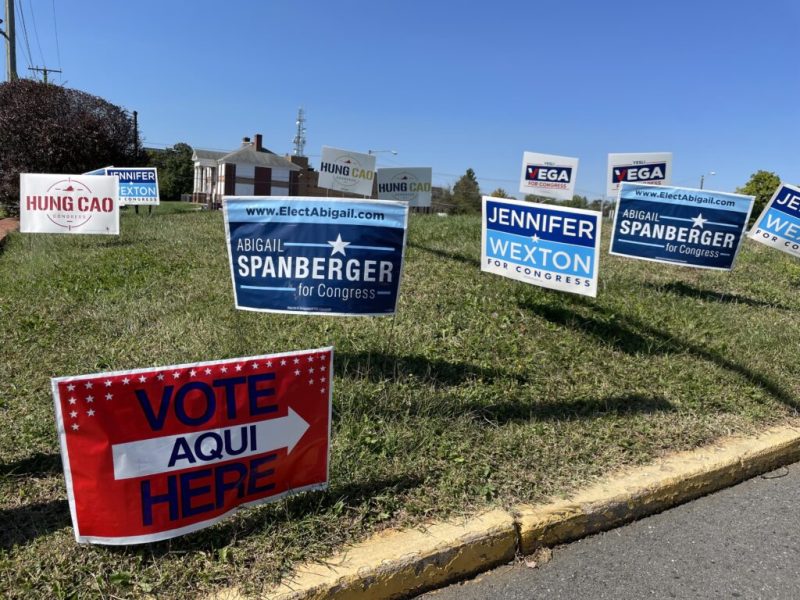 Campaign signs outside the election office in Prince William County, a closely watched battleground in the midterm contests. (Graham Moomaw/Virginia Mercury)