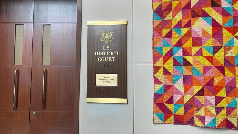Shown is the door to the courtroom of U.S. District Judge Theodore David Chuang in Greenbelt, Maryland, who will rule on a nationwide injunction request from religious groups opposed to a Trump administration policy on immigration enforcement in places of worship. (Photo by Ariana Figueroa/States Newsroom)