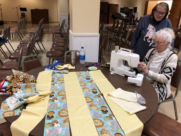 Stations were set up in the church fellowship hall for cutting fabric, sewing, tying the blankets off with yarn, making squares and organizing the fabric. Volunteers brought sewing machines and thread, cutting tools and yards of regular cotton fabric and washed and dried flannel.