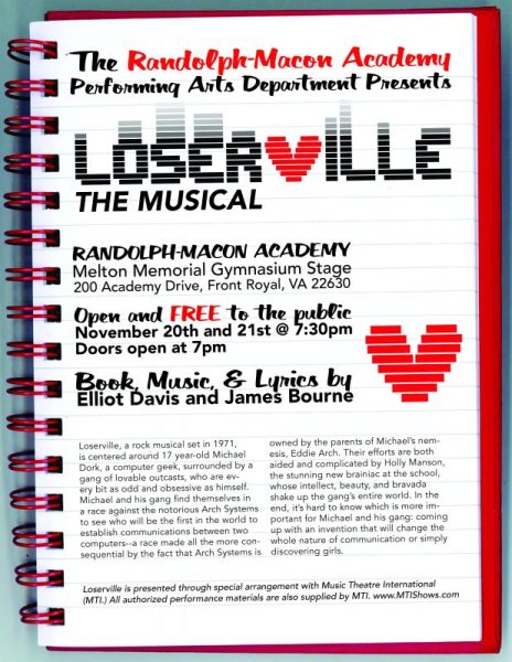 On Wednesday, November 20th, and Thursday, November 21st, Randolph-Macon Academy’s Performing Arts Department will present its 2019 fall production of Elliot Davis’ and James Bourne’s musical, Loserville. The musical, which will take place in Melton Memorial Gymnasium on the R-MA campus in Front Royal, is open to the public, and it is free. The doors open at 7:00 p.m., with the two-hour play (including intermission) beginning at 7:30 p.m.