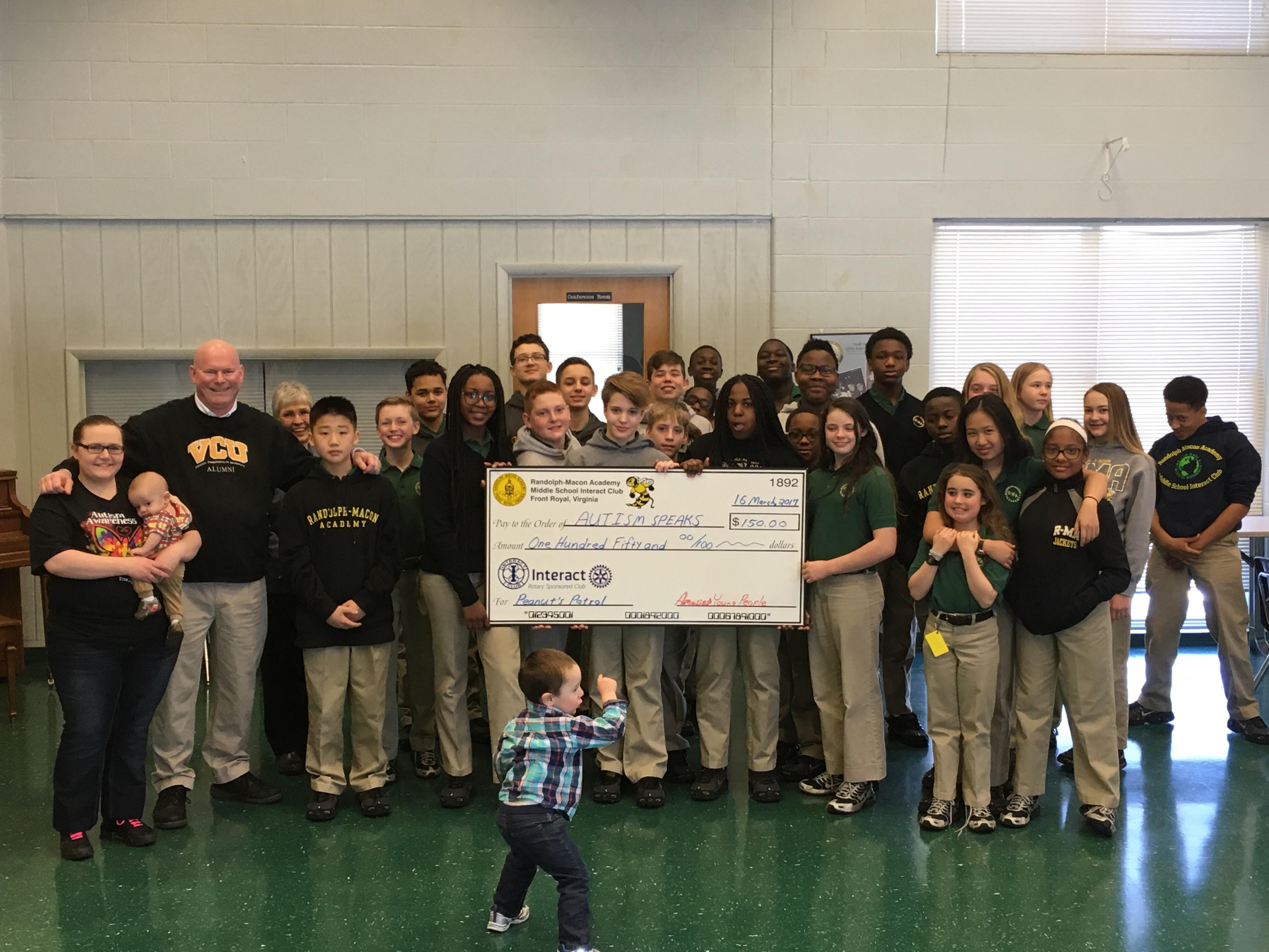 On Thursday, March 16 at the weekly Interact Club meeting at Randolph-Macon Academy Middle School, students presented a check to Christina (Harper) Smith (R-MA class of 2008) in the amount of $150 to the organization Autism Speaks, in honor of her son “Peanut” (center of photo) and “Peanut’s Patrol”.  Smith has set a goal of $2,000 of this Autism Speaks fundraiser.