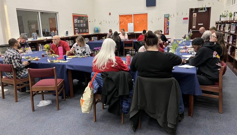 “It’s all about collaboration,” said Samantha Barber, president of Reaching Out Now (RON), as adults who had been relieved of their children sat down to a delicious Valentine’s Dinner prepared by culinary artist Devin Smith and his students at the Blue Ridge Technical Center Culinary Arts program. Organized by RON as the Better Together Family Night Out, this event took place at Skyline Middle School, starting at 5 p.m. and lasting until 7 p.m. on Wednesday, February 14. While their children enjoyed a range of activities and ate pizza in an adjacent room, parents were invited to relax while Warren County teachers temporarily assumed the job of childcare.