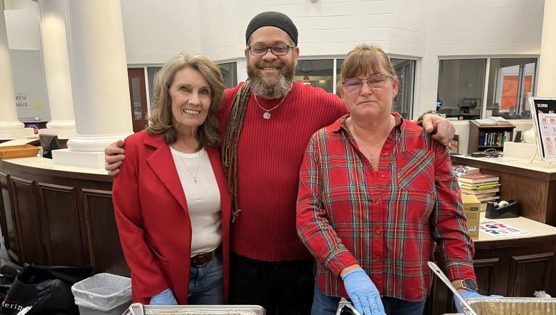 Above: Volunteers serve food to the Valentine’s Day crowd. (L) to (R): River Pangle, Beverly Sims, Cheryl Cullers, Dawn Clark, and Arazely Zinn. Below: Culinary artist Devin Smith stands with two volunteers, Beverly Sims to the left and Cheryl Cullers to the right.