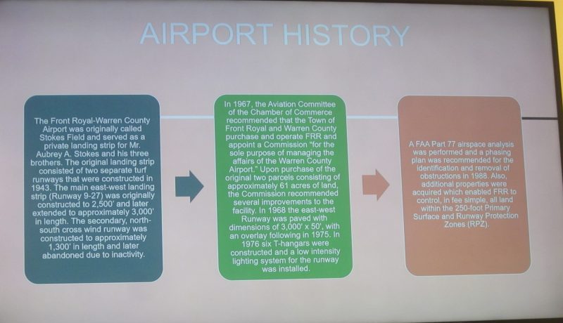 WC Public Works Director Mike Berry focused a portion of his presentation on capital improvements at the County-overseen Front Royal Airport (FRR).