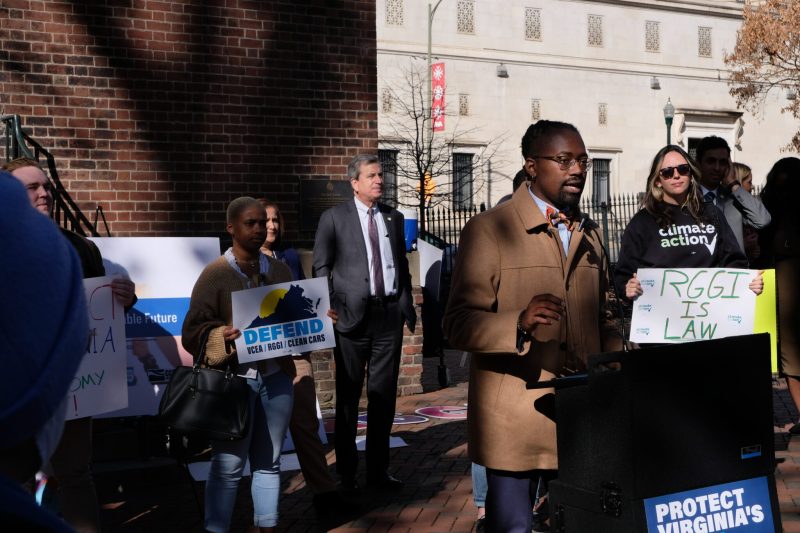 Del. Nadarius Clark, D-Portsmouth, speaks during a legislative rally Friday about his caucus’ defense of laws that address climate change.