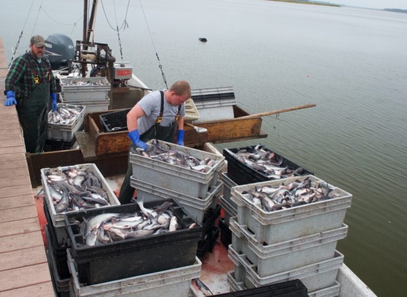 Commercial waterman Wayne Fisher and his son Aaron land blue catfish caught in a pound net in the Rappahannock River near Fones Cliffs in 2015. (Bill Portlock / Chesapeake Bay Foundation)