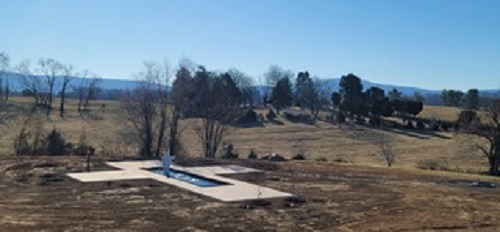 Rockland Community Church’s prayer garden, now 75% complete, features this life-size, white marble effigy of Jesus Christ looking out over a 40-foot long koi pond. With 5,500 bricks already laid, placing of sod, mulching and fencing remains to be done prior to the April dedication.