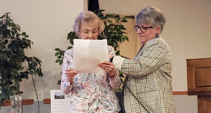 Fifty-year Rockland resident Jo Ann Nichols receives a hand with her script as she becomes the stand-out speaker at the Rockland residents meeting. Photos by Susan O’Kelly
