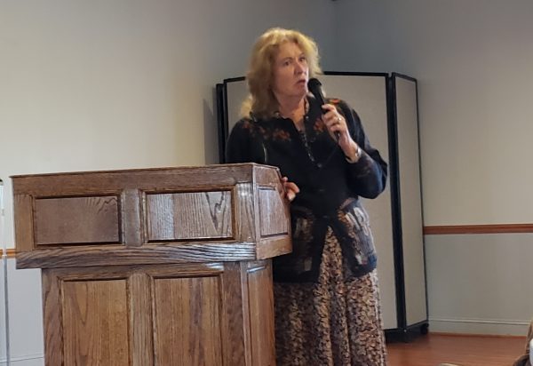 Lifelong resident and local cattle farmer Susan Bowen takes the mic at the community meeting.