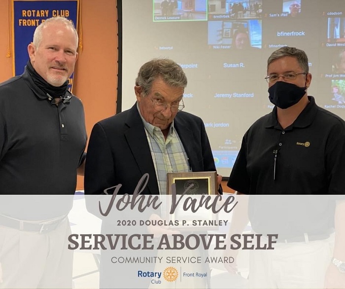 At last Friday’s meeting, the Front Royal Rotary Club announced the creation of the Club the “Douglas P. Stanley Service Above Self Community Service Award” to honor Doug’s commitment to leadership and public service in Front Royal-Warren County. The Club presented Doug with a plaque honoring his service to the Club and community, and Doug presented former Warren County Supervisor John Vance with the 2020 award. John has distinguished himself through three decades of involvement in community, civic, and charitable organizations.