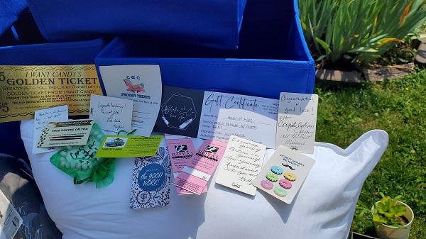 The inspirational cards will have gift certificates/gifts enclosed from a variety of local businesses including: 1 free scoop of ice cream from C & C Frozen Treats, 2 movie passes from Royal Cinemas, 1 free cup of coffee from Main Street Daily Grind CAFÉ, 1 bracelet “We’re In This Together” from Project: Space/What Matters, 1 free haircut from Mattie the Barber/Blake & Co Hair Spa, 1 Golden Ticket from I Want Candy (for the lucky basket), 1 Pass for in-town cab fare with Front Royal Taxi.