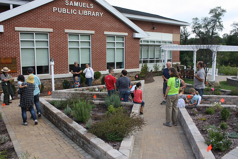 In its attractive new newsletter (3rd issue) Samuels Public Library thanks employees of the local Lowe’s store at Riverton Commons for their efforts to install a new Rain Garden at the library, hoping they will “stop by when the weather warms to enjoy the new space!”
