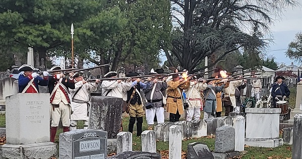 The ceremony was emcee’d by Dale Corey with the Virginia SAR combined color Guard presenting colors and firing a musket volley to honor the patriot. Compatriots from the Colonel James Wood II, Culpeper Minutemen, Fairfax Resolves, Fort Harrison, George Mason and Sgt Maj John Champe Chapters along with the Lanes Mill DAR Chapter paid homage to Helphenstine. Descendants of Helphenstine participated with Ed Helphinstine, Jr and his daughter Sarah unveiling the marker. Ed Helphinstine, Sr and his daughter Leah presented a wreath. Reverend Jim Simmons provided Chaplain duties with Ed Helphinstine, Jr providing a presentation on his ancestor.