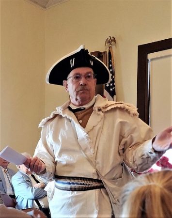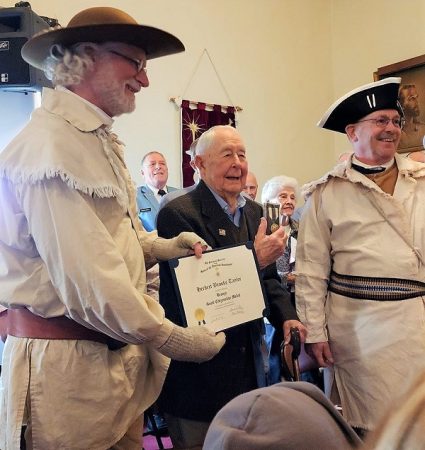 Presenting the medal was chapter President Chip Daniel with assistance from Richard Tyler. Other SAR members present in colonial attire included Dale Corey and Kelly Ford. SAR compatriots who are members of the Korean War Veterans were Marshall DeHaven, Lew Ewing, Doug Hall and Raleigh Watson. Additional members of the Korean War Veterans Association present to honor their fellow veteran were Paul Bombardier, Steve Culbert and Robert Shirley.