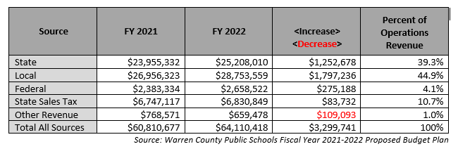 The WCPS proposed budget gets adopted by the Warren County School Board each year and submitted to the Warren County Board of Supervisors. The budget covers the fiscal year (FY) July 1 through June 30 of the following calendar year. WCPS receives funding from three main sources: state, local, and federal, with the district receiving 45 percent of revenue from Warren County for the operation of the school system and funding for capital improvement projects. Other miscellaneous funds generated from secondary sources provide additional revenue streams for the division, Ballenger said.