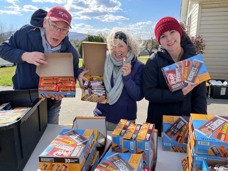 As part of a Virginia Hills Church initiative, left to right, Todd Jones, Pattie McHugh, and Alyssa Derflinger prepare candy for “Light the Night,” for which Jones and his wife, Sharon, showed hospitality outside their home.