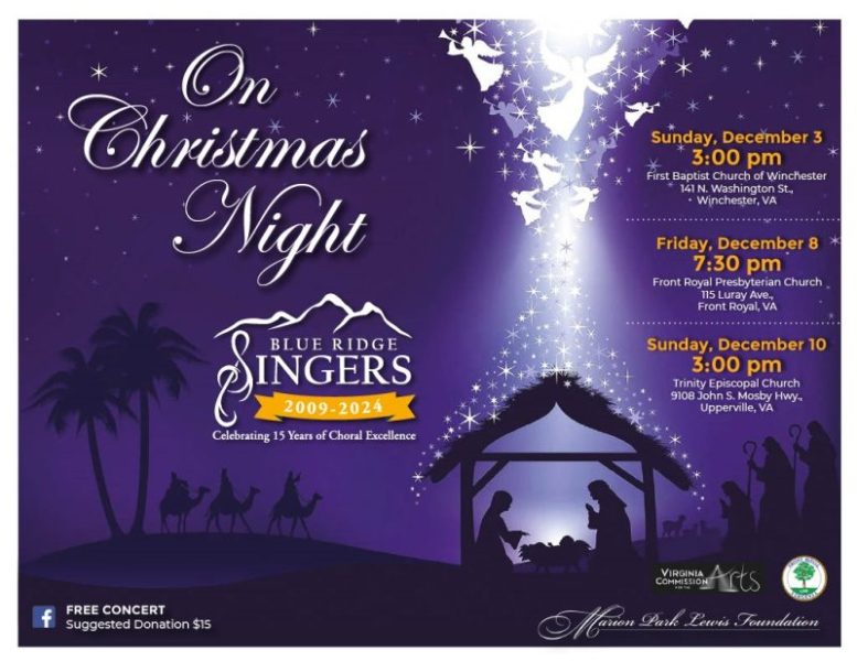 The centerpiece of the concert series is “On Christmas Night” by Bob Chilcott. This eight-movement work, featuring choir, soloists, and organ, artfully weaves common Christmas carols with original music and text settings. With the choir’s soloists emerging from within its ranks, the depth and talent of the Blue Ridge Singers are sure to shine.