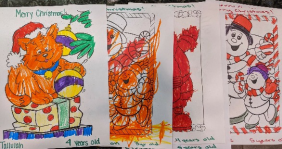 Kristen Tulallah and Josh Pence prepare drawings to send to the nursing homes. Kristen and her family sent 68 Christmas cards to Hidden Springs Senior Living in Bentonville.