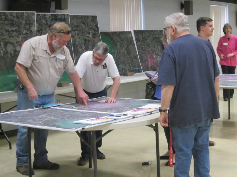 Abandoned, overgrown railroad tracks or a transformed ‘Rail Trail’ connecting communities for low-impact recreational walks and bike rides. Below, informational tables drew members of the public, here including FR Councilman ‘Skip’ Rogers, left in white shirt, and WC Supervisor Walt Mabe, right blue shirt, prior to official agenda presentations.