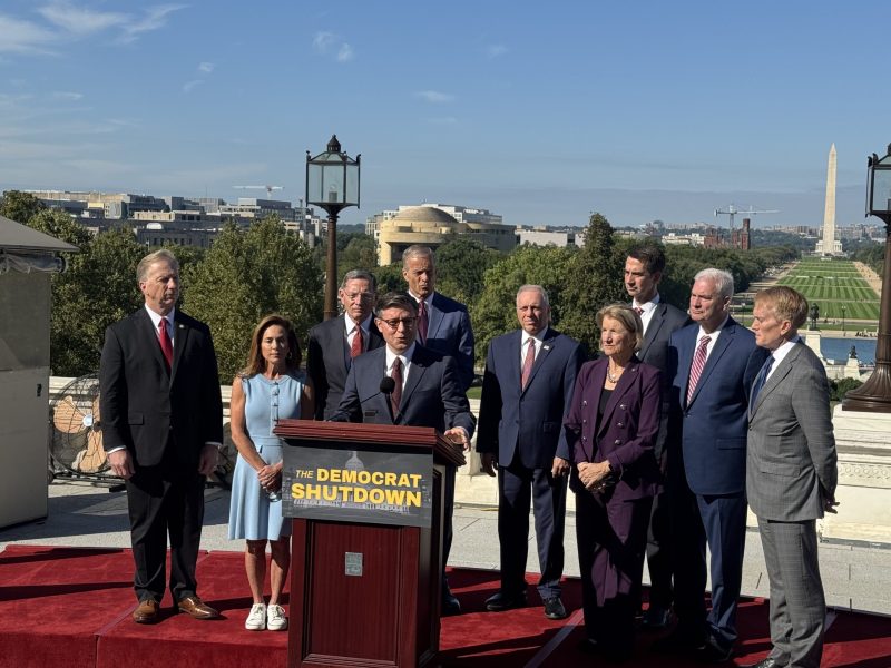 House Speaker Mike Johnson of Louisiana speaks at a press conference outside the U.S. Capitol on Oct. 1, 2025, in Washington, D.C., alongside fellow GOP leadership in the U.S. House and U.S. Senate. (Photo by Shauneen Miranda/States Newsroom)