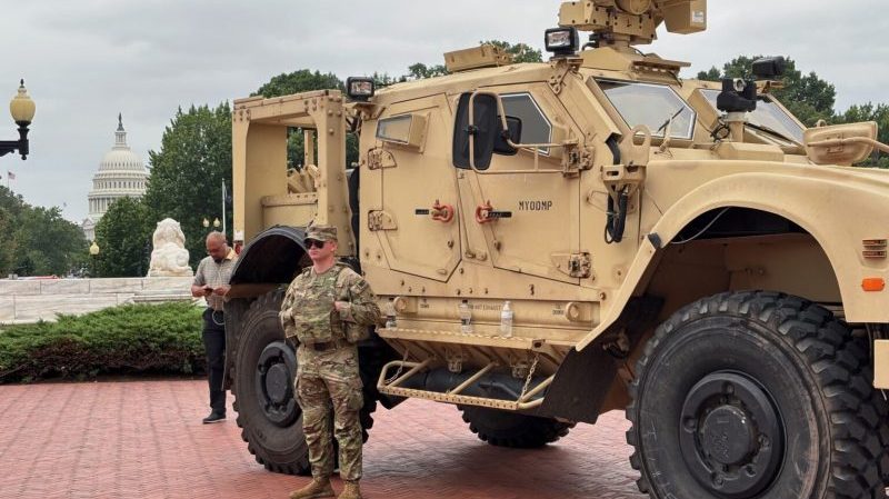 A member of the National Guard stands alongside a military vehicle parked in front of Union Station, near the U.S. Capitol in Washington, D.C., on Monday, Aug. 18, 2025. (Photo by Jane Norman/States Newsroom)