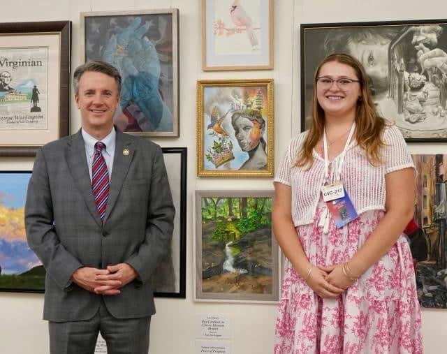 Congratulations to Brooke Justus, an 11th-grader from the Burton Center for Arts and Technology in Salem, for winning Virginia’s Sixth District Congressional Art Competition. Her picture on the wall behind us, “A Roanoke Forest,” is officially hanging up in the United States Capitol and will be showcased all year.