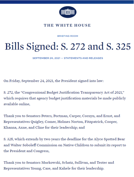 Throughout my career, I have worked to make government at all levels more transparent to the people it serves. Transparency in and of itself is key to good governance and is not a partisan issue. That is why I was pleased to work with both sides of the aisle to get the Congressional Budget Justification Transparency Act signed into law. Congressional budget justifications are plain language explanations of how agencies propose to spend money that they request from Congress. While agencies produce an annual congressional budget justification, they are not always made publicly available. With this bill now being signed into law, agencies are required to post those justifications on a single, searchable, publicly available database. This is a win in ensuring the Federal government is more accountable to the taxpayer.