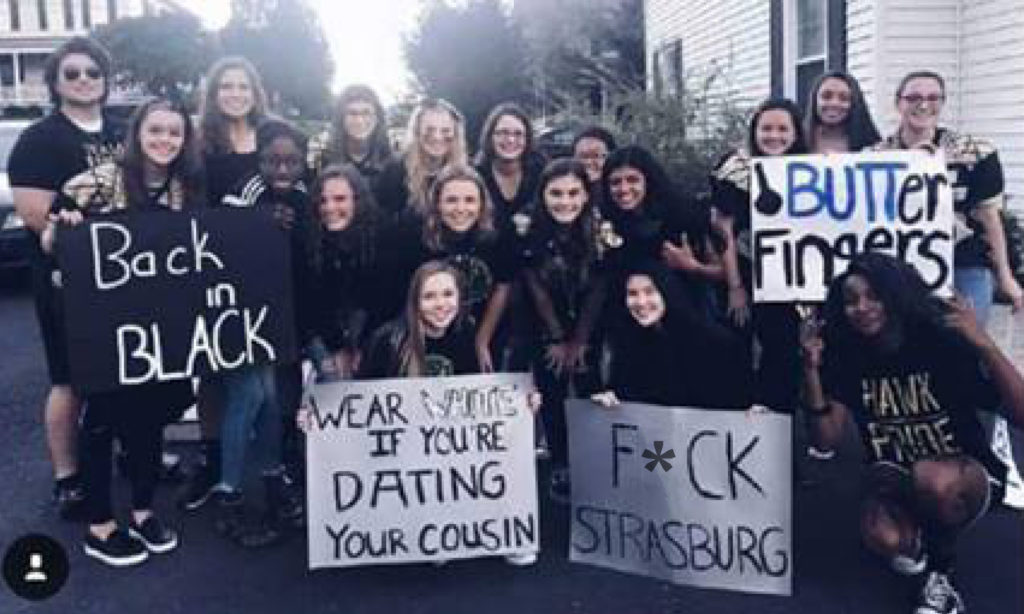 In the photo 17 female students and one male surround four posters – one sporting the old AC/DC song title “Back in Black” and three containing profanity and sexually-tinged slams at Strasburg, the town, high school and student body. One appears to reference an incident of sexually abusive behavior involving a Strasburg athletic team last year; another indicates an incestuous predisposition of those wearing white – perhaps ironically Skyline wore white visitor’s jerseys in the Friday evening game, which Strasburg sporting home purple won 28-3.