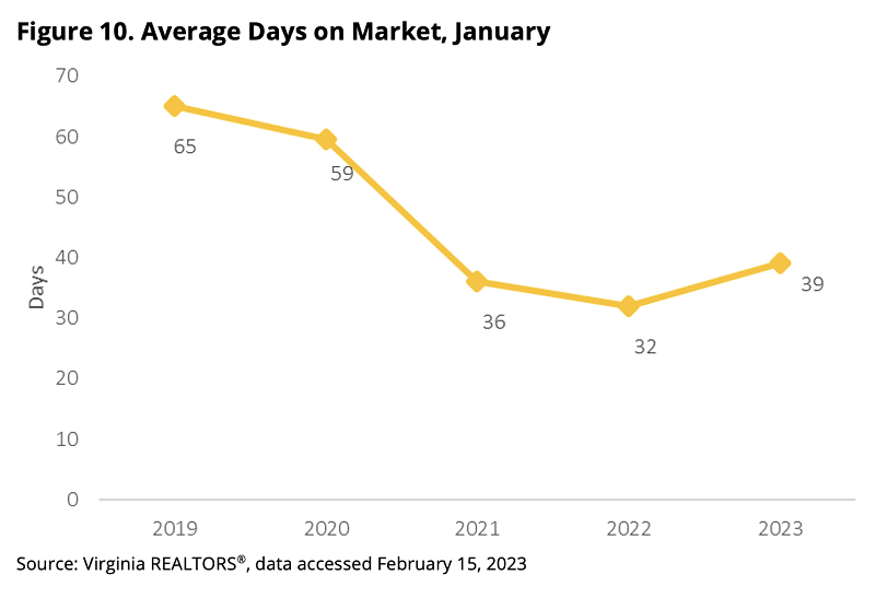 In Virginia, the average days on market has been slowing since last summer. “This cooling has been a result of rising interest rates coupled with rising home prices and a lack of homes available on the market. This has led to more potential buyers choosing to sit on the sidelines,” says Virginia REALTORS® Chief Economist Ryan Price. In January, the average days on market statewide was 39 days, a full week longer than January 2022.