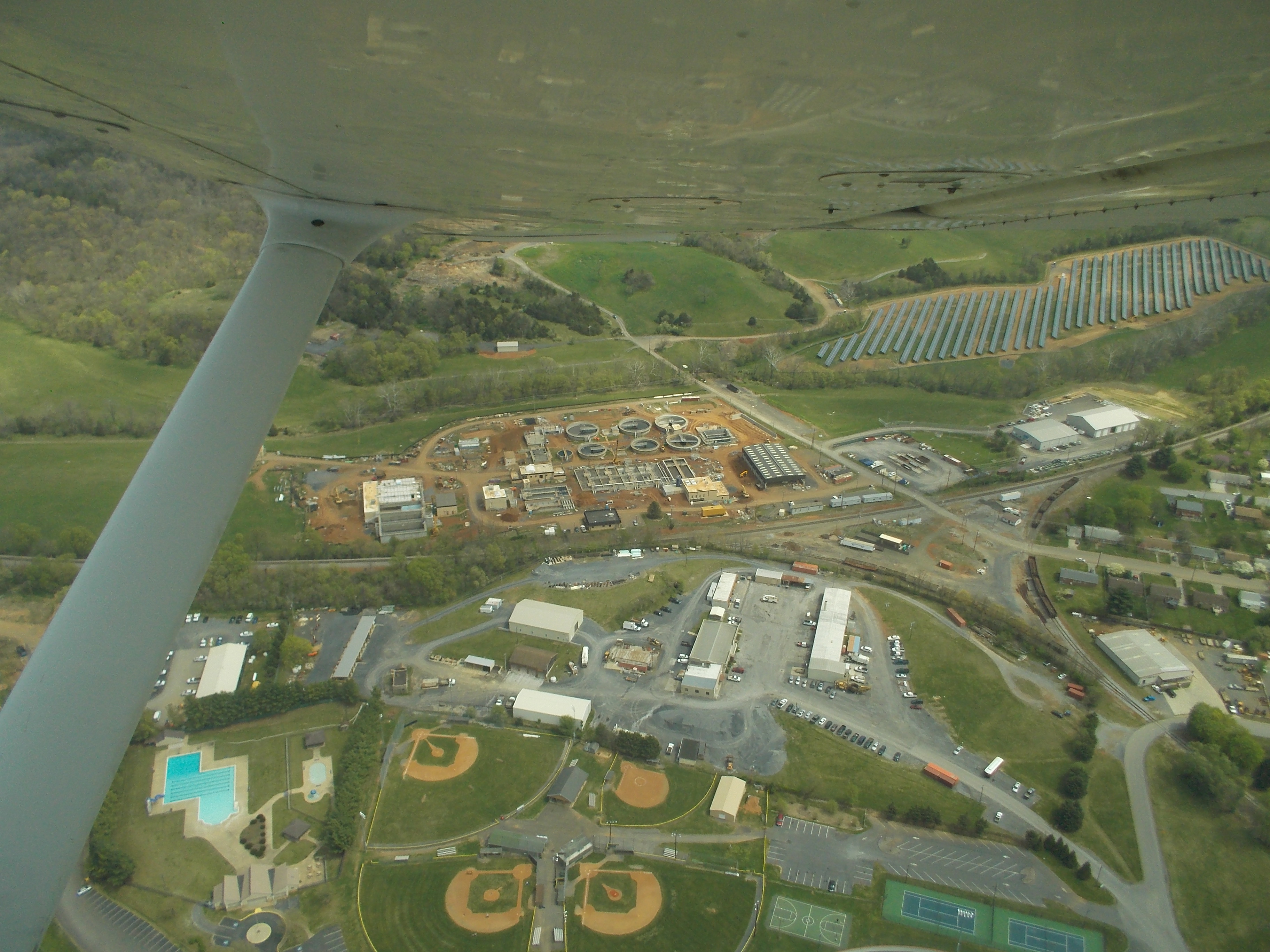 The Town’s Energy Services Department headquarters lies below the solar field and the Public Works complex is below the WWTP.  In the bottom half of the photo are the various youth league baseball parks, tennis and basketball courts and the Stokes community swimming pool.